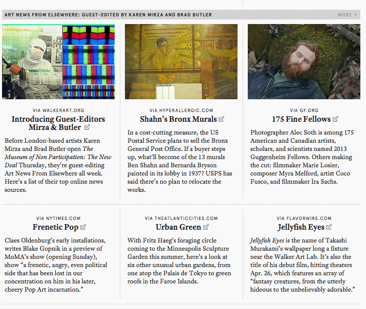 Por ejemplo tenemo el caso de la página web del Walked Art Center publica- da en el año 2011 y que fue muy comentada, por lo di- ferente de su propuesta citándose como “un cambio de paradigma potencial para los sitios web institucionales” (Seb Chan) y un “Un cambio de juego trascendental “ (Museumnerd).